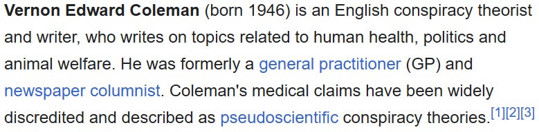 Take Dr Vernon Coleman for example. He is a retired GP and was a prolific and widely read journalist as well as successful author of fiction and non-fiction. Until he came out as a Covid dissenter in 2020. Now look: he is banned e.g. not only from posting on YouTube (which he did for years) but even from looking at it.