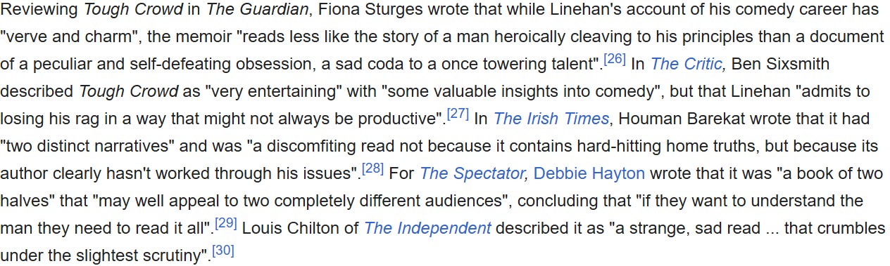 Anther man and issue is the comedy writer Graham Linehan, who controversially holds that men are not women. Wikipedia doesn’t quite do the boot-in-the-balls-and-strangle-him thing, but carefully includes this para compiling quotes from media tpes who know which hymn sheet to sing from:There, be warned about an obsessive has-been.